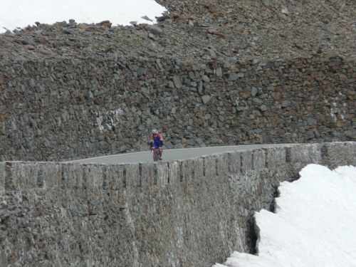 The scenery is hard to describe or to catch in a picture. Probably you’ll need a panorama camera in horizontal and vertical direction. And even than you don’t get it. It’s better to come here, especially by bicycle. Brilliant. 25 kilometres of climbing from the peaceful Adige valley to the snow at the top, 2000 meters higher.