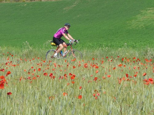 I started as one of the last people and just before the town of Gela I had overtaken several cyclists who had an earlier start. We formed a line of 10 cyclists through the busy town of Gela with a lot of market stalls full of fresh fruit. After we turned inland, the road started to climb slightly and a few couldn’t catch up. The rest of the day I cycled in a group with Trudie from The Netherlands, Christian and Jean Marc from France, Jørgen from Denmark and Beat from Switzerland. The morning was sunny, but during the day the sky became more and more cloudy. The lunch spot was next to the road in a field of poppies. Marco got help from Madeleine and Hélène and they had prepared the basic, but delicious, Italian tricolore : cherry tomatoes ( red ), mozzarella ( white ) and basil ( green ). Bread and fruit filled the stomachs for the second part of the day.