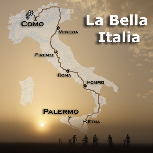 The Giro d’Italia started Saturday May 10th with a time trial of 28,5 kilometres in and around Palermo. One day later another group of cyclists left Palermo for their own Giro, called “La Bella Italia”. Cyclists from France, Denmark, Switzerland, Australia, Qatar, Brazil, United Kingdom and the Netherlands found their way to the Sicilian capital, male and female. None of them were professionals or well-trained amateurs. It was not a peloton of 200 cyclists riding at speeds above 40 or 50. The males and females were relaxed, determined cyclists, who love to cycle and were looking for a new challenge. And it was definitely a challenge:3.000 kilometres with the volcanoes of the Etna and Vesuvius in the first part of the tour, the Apennine Mountains in the middle, the Dolomites in the far north and the Passo dello Stelvio one day before the finish in Como. In between were continual rolling hills and stunning coastal roads.