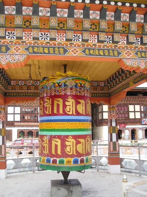 This colorful 8’ tall prayer wheel is conveniently located in downtown Paro, Bhutan.