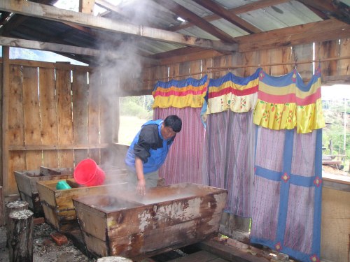 Dorje, my Amsterdam-educated driver, checks the temperature of my hot stone bath at the Gantey Palace Hotel in Paro.