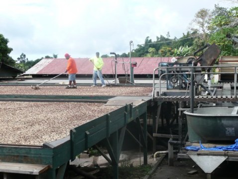 We then headed to the drying area where beans are pulped, dried and hulled to remove their parchment. Mill machinery sorts the beans into distinctive grades based on size and shape.