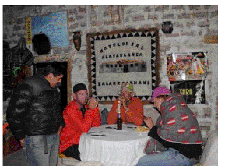 The salt hotel doesn’t have electricity or heating. The altitude of the lake and the hotel is 3.653 meter and results in freezing temperatures after sunset. The dinner is served by candle light and everyone wears his or her warmest clothes. The soup, plain spaghetti and chicken taste wonderful after a day out in the Salar. For the taste we add just a little bit of … yes, salt.