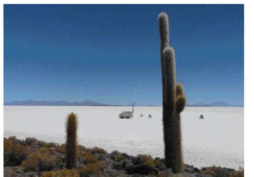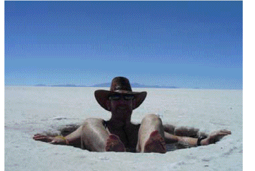 After tens of little climbs the Salar appears suddenly like an ocean of white snow, salt, ice… Stunning. Dazzling. Startling. Impressive. Extraordinary… Do we have more words to describe it? As an instinctive reaction we all together stop our bikes to sink in the first impressions of what we see. I think that Moses must have felt the same when he saw for the first time the Promised Land when he was standing at Mount Nebo. The feelings are maybe the same, the actions probably not. We take out our digital camera’s to make pictures and shoot videos. If Moses would have had the opportunity, he would probably have done the same.