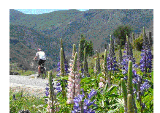 The scenery is amazingly beautiful with its fresh green grass, monkey puzzle trees, rocks and melt water creeks, but the wind conditions make our “cycling”-day harsh. Nobody gives a damn about the scenery. The wind takes all our attention. The squalls rage with high speeds around our faces and ears. No time for a normal conversation, even screaming doesn’t make sense. We bow our head and push the bicycle steer down to prevent the bicycle being blown away.