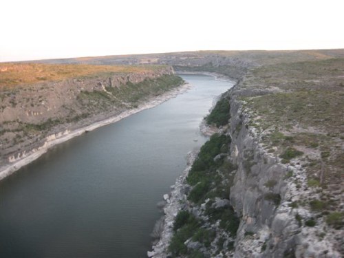 The setting sun throws a splash of gold across the eastern cliffs as we cross the Pecos River. It’s official now: I’ve come from “west of the Pecos.”
