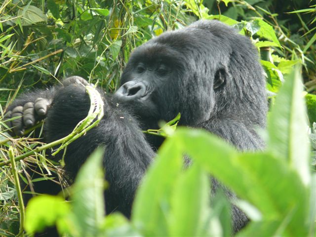 Some of us, including this writer, were becoming quite impatient, but after another fifteen minutes we were told to follow the guides. Within ten minutes we started to see the gorillas! We saw babies and juveniles first, then several females and black back males. The leader of this group of forty three individuals, the silverback male, was not in view. Mountain gorillas are the largest primates on earth. A full-grown silverback male can weigh over seven hundred pounds, and these are massively powerful creatures.. Mountain gorillas have thick black fur, prominent noses and foreheads, and keen, penetrating brown eyes that reflect the sunlight. They are strict vegetarians, eating the plethora of plants that abound in the Virunga’s. Their favorite foods are celery, bamboo shoots and other green stalks. These plants also provide all the gorillas their daily intake of fluids, as they drink almost no water. The gorillas seemed quite comfortable in our presence and very interested in what we were doing, especially when we made eye contact with them. The first young male I made eye contact with stared intently into my eyes, and I felt an immediate bond and sense of intelligence between us. It was I who broke the eye contact, and I believe the gorilla would have kept staring forever! It occurred to me that we had much to share if I had the language of the gorilla and he had mine.
