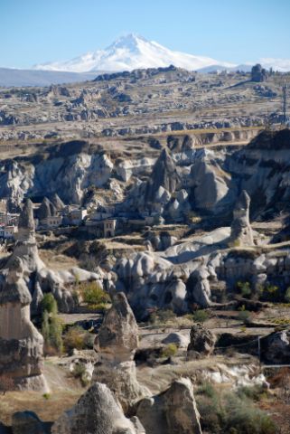 Snow covered extinct volcano in background which helped create formations of lunar type landscape around Capadoccia.