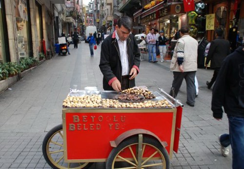 Street vendor selling roasted chestnuts from hot dog-style cart.