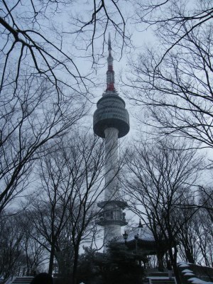 The following day we were slated to meet up at Namsan Mountain in the center of Seoul. I rose early, caught the subway to Myeongdong and managed to link up with Jeff and his friend Bryan. We had to wait a little while for Adam and Elaine, who had quite understandably been out partying hearty the night before in shakin’ Sinchon (the university district, where all the bars are) and who had woken up a little late. We took a cab up the mountain to the cable car station and rode in a little glass box with 30 other passengers the rest of the way. I nabbed a spot in the front left corner and was treated to a fine view: Seoul under the winter sun and Namsan mountain’s rugged contours in a gossamer gown of powdery snow. The meal at N’Grill, the rotating restaurant which sits atop N’Seoul Tower at the summit of Namsan, was small but tasty. Disappointingly, we were there two hours and rotated through only 270 degrees of the compass.