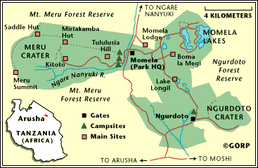 Our first day in Tanzania was a long one, having flown overnight from another part of Africa, but this first day of Safari was so very exciting. We went immediately from the airport to nearby Arusha National Park, the smallest of the National Parks in Tanzania and often missed. Abrojaley Africa Ajabu tour company, which planned our entire trip, provided the two of us an EXCELLENT guide, Manase, who drove us in a well-equipped and comfortable Toyota Land Cruiser very carefully over the bumpy terrain, which climbed quite high so we could have good views of the crater valley and the 4,500-metre peaks of Mt. Meru within the park. This park covers 137 square kilometres (52.0 square miles.)