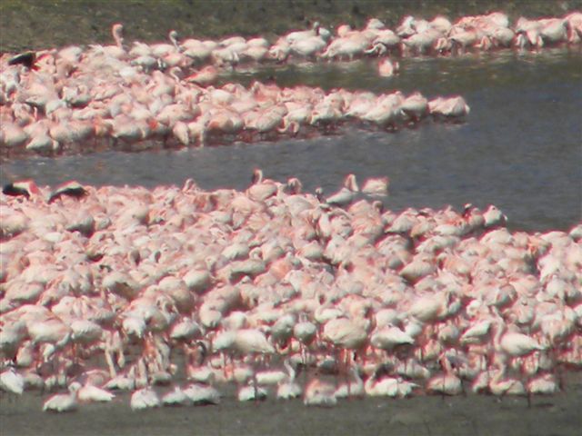 As we bounced along through this park all day we saw herds of Cape Buffalo, giraffe, zebra, warthogs, and bushbucks and many other individual animals. We came to the Momella Lakes, which are highly alkaline and salty. Flamingos love the fine smorgasbord they find here and we saw literally millions of them. The flocks line the edges of the lakes, making a pink border. In one place we saw white flamingos swimming serenely like swans. This was a lovely scene to end our day, and Manase returned us to the city to meet the head of Abrojaley company, Abdul Meena. We found him to be very personable and friendly, as well as thoroughly knowledgeable of his country and all its wonders.