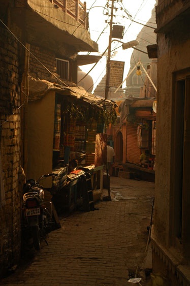 As deafening as the music was in my ear, I was literally sitting atop the speaker, the sound quieted my mind and I watched the city of Varanasi unfold before my eyes. The scattering of shops spilling out into the street, block upon block, metallic containers, rainbows of bangles shimmering in the sun, greased motor parts, jewelers dressed in white cupping hot tea, young women hovering around fruit stalls and cows grazing through the garbage. The low rays of the sun tangled in the mess of dust particles as we veered into a small alley, avoiding collision with an ox cart. Our driver then dropped us in old town Varanasi.