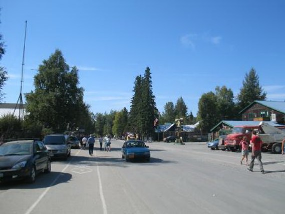 We left the main highway and took a 14 mile detour on a two-lane road that ended at a rustic, little outpost seemingly in the Alaskan boonies. Forty to fifty foot birch and spruce trees surrounded a small village center. The 600-mile Alaska Mountain Range with its most famous peak, Mount McKinley (locals refer to the peak as Mount Denali, the official Alaskan name) towered just beyond the forest. As we looked around at a handful of old log structures and worn, clapboard storefronts along the main road, the “downtown” felt like an abandoned frontier town. It had a wild, west pioneer feel. I quickly discovered from a brief stroll along Main Street that it stretched for an entire one-block and was the only paved road in town.
