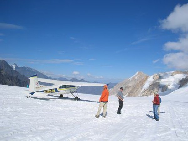 The approach to the gigantic piece of ice was a bit unnerving. I hoped we could stop before we ran off the edge or into the side of a mountain. The landing was smooth as the airplane skis touched down on the glacier. We taxied around and came to a slow, rolling stop. We carefully piled out of the plane. The crisp, cold air filled my lungs. My first impression was the staggering size of everything around me. From the air, the mountains and ice seemed enormous and endless. On the ground, with us and the plane to set the scale of our surroundings, the vast size of the Alaskan mountain range and its glaciers was even more astounding.