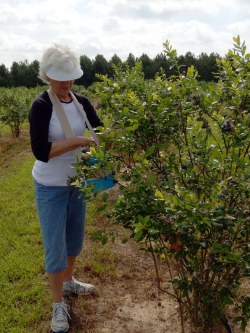 We didn’t need gloves because there were no thorns, no weeds, no snakes, no varmints…just a lovely grove with about twenty people picking berries for their own use. The one and two gallon buckets the owners provided hung easily on our arms and, to my great surprise and delight, I had one filled in ten minutes with practically no effort at all! At that time the price we paid in a super market for about a cup of blueberries was $4, and for just $10 we picked the gallon! The price, of course, varies by the crop each year.