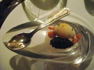 BANK Café & Bar, Westin Verasa Napa, 1314 McKinstry Street, Napa, 707.257.5151, http://www.starwoodhotels.com–Chef Ken Frank makes his exciting cuisine available all day inside in a casual open area off the lobby and outside by the pool (nestled by a nature preserve and the Napa River). Lunch is about tantalizing dishes: Pajaro’s Shrimp Cocktail (slow poached shrimp over gazpacho sauce), Soy Glazed Pork Belly with Gingered Brussel Sprout Slaw, Daikon Sesame Salad with Radish Sprouts served with shrimp, golden caviar and crab and sandwiches that change daily (crab cake with Asian mustard dressing the day I visited). Sip Domaine Carneros 2005 Brut and you’re set.