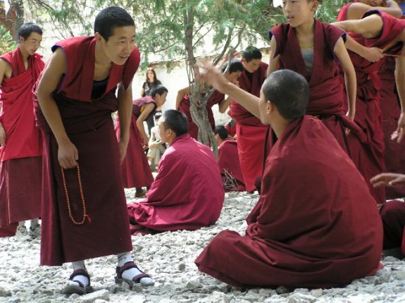 I just got interrupted by another family member recipient of the presents I have delivered, and they all want to feed me! I am about to explode on yak “mom’s”! (little dumplings). I had met all the families of my Tibetan friends in the United States, and tonight we go to see “typical” Tibetan dance. Today I saw a big group of monks arguing about the scriptures, famous here. The place is packed with tourists, so I have a nice mix of touristy stuff and typical local stuff. My sweet guide is a young Tibetan girl, Tselhamo, 20 years old, and we bum around like sisters doing whatever we want (well, almost, given the heavy military presence). Today I got to ride a bus with her, and the police stopped it to check everyone. It was a little creepy.