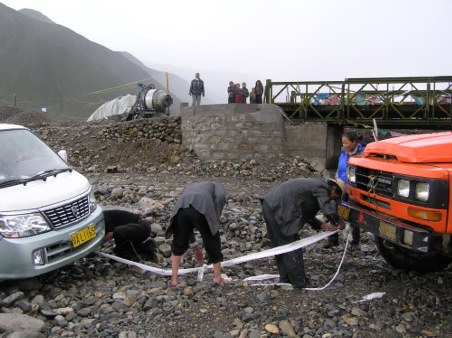 Over bumping, sliding, curvy, pot-holed, dirt paths we struggled, but the scenery was lovely, with mountains and the river and the yaks, goats, sheep, horses, the old stone houses with bright doors and stupas with flags and scarves, and even the nomadic brown tents (not like yurts at all!, way simpler)…. so on and on we go, and I am thinking how is it I always seem to end up on these routes with no other travelers? Out in the middle of nowhere? when, lo and behold, as we are trying to get through yet another rocky river where the “road” has washed away, we get stuck! Ah yes, again, this also seems to happen to me a lot. And of course it chooses to not just rain, but hail at this moment! Now, not only do I have my little 20 year-old translator/guide, but also two drivers so they can take turns, and here they are without their shoes trying to dig us out! Then they try to tie a prayer scarf to another truck so it can pull us out! A prayer scarf for God or Buddha’s sake!!!! I tell Tselamo (my guide) that this will never work, and we must find a real rope or chain, so we go off searching while the boys mess around with scarves… and we find one, and it worked, and we got out… brains over braun any day! And I told Tselamo “note to self, never go on a road trip without a rope and jumper cables, extra tire, water, flashlight.” The list went on and she smiles and nods…. these are a sweet people, always smiling.