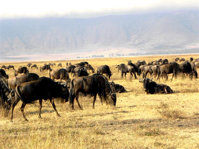 Even though it was near the end of the dry period when we were there in October, the huge herds of wildebeest still found plenty of food and looked healthier than the domestic animals we saw in other places. These strange looking animals are well adapted to the climate and migrate over a thousand kilometers when necessary to find food. The herds we saw live permanently in these plains, where the small river is enough for them in the dry period.