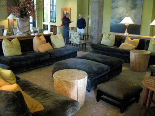 In a newly renovated “barn” room, Joe Bartolomei gave us a quick lesson in “touch” control – from igniting the fireplace (enjoyable from the bedroom and the outside deck) and warming up the tub jets, to heating the bathroom floor and the ultimate surround system and flat screen TV. Don’t forget the steam shower. The colors and textures of the furnishings, the vaulted ceilings and the floor to ceiling windows bring the outside in. Hanging out in this lush getaway was tempting, but wine tasting waited.