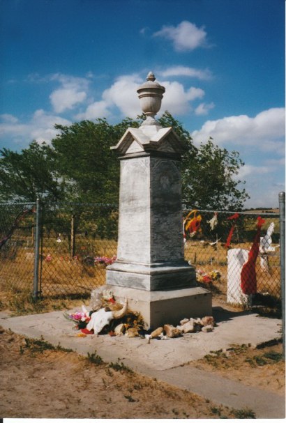 On the east side of the road at the site of the massacre were a couple forlorn booths with handcrafts for sale. An old man slept at one and a couple of kids played in the dirt by the other. On the west side of the road is a white circular building containing mostly posters and propaganda for AIM (American Indian Movement). There are testaments to Russell Means and Leonard Peltier and the demonstrations, minor insurrections and violence perpetrated against and by AIM. There was surprisingly little information about the history and events of the 1890 massacre. On two hills behind the building are two small cemeteries. I looked around both, but didn’t see any monument to the massacre. I asked, and a Sioux man pointed toward a fenced area of about ten by six feet back in the closest cemetery to the AIM building. Within the fenced area is a six-foot high granite monument with names of victims and a description of the massacre. (Although my Mom’s article said 300 of the 350 Sioux at Wounded Knee were killed, I counted fewer than 40 names on the monument.) A few token offerings were scattered around the base of the monument.