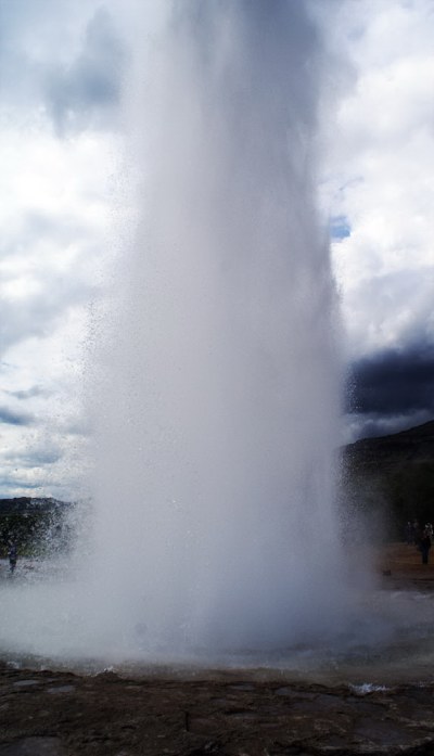 The geyser shoots skyward, two, three, and four stories tall. And it’s not even the big one. Geyser itself has decided to take the afternoon off. Instead Wade and I stand around gawking at its “smaller” cousin. The smell of sulfur permeates our nostrils and steam rises from pools all around us and seeps into our pores. Have you ever heard an entire tour group go silent? A hundred cameras silently burn a hundred photos of white water on white sky to their memory cards. I’m one of them. As the geyser implodes with a final sigh, I have to fight the urge to walk over and touch the pool of water ominously bubbling in its place. But Wade’s a step ahead of me. We move over to a less threatening pool and Wade puts his pointer in without thinking. He yanks it back in shock and shakes his hand dramatically. But his pain isn’t quite enough to let me infer just how hot it is. I hesitantly dip my pinky in and quickly pull it back. Damn! I blow on my pinky and the wind cools it. We walk away with throbbing fingers and no exact temperature measurements to be found but I hear another tourist curse in pain behind us as he tries to take his own. Humans are so strange.