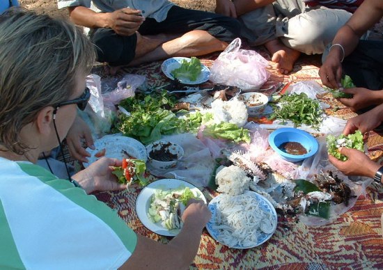 Pon arranged for us to go on a Laotian BBQ with two of his friends and their girlfriends. Our first stop was a colorful market where we picked up fresh lettuce, rice, and a variety of local produce. The crowded stalls were filled with fresh vegetables and fruits that comprised every color in the rainbow, and the sounds of vendors hawking their goods, which often quacked or oinked, permeated the stalls lining the dusty lanes.