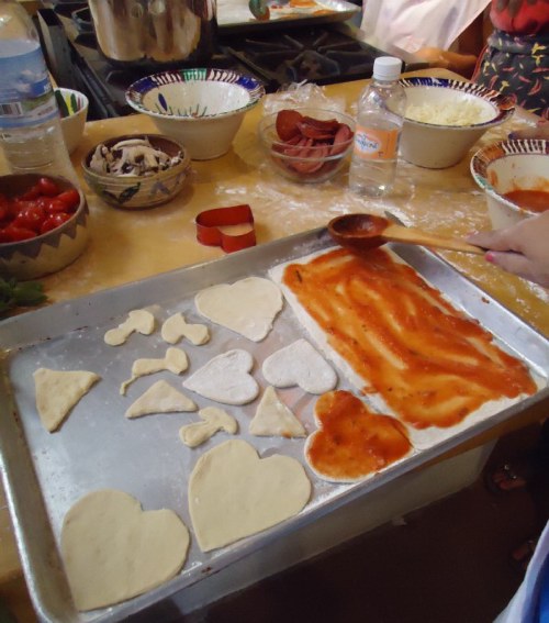 “Okay, anyone want a cookie?” Three times in the course of the lesson, short breaks are encouraged so as to not overload information intake nor run the risk of boredom setting in. “There are plastic bottles of water over here, and a couple of marking pens so each of you can write your name so they don’t get mixed up.” The children are given a choice of making large or medium crusts, by shaping the dough themselves or choosing from the several small forms which are provided: hearts, mushrooms, trees, and squares, triangles, circles. The sauce has been pre-mixed, but the children are encouraged to choose their toppings from selections of veggies, sliced meats, and even fresh basil. “Did you know that a mushroom is actually a fungus?”