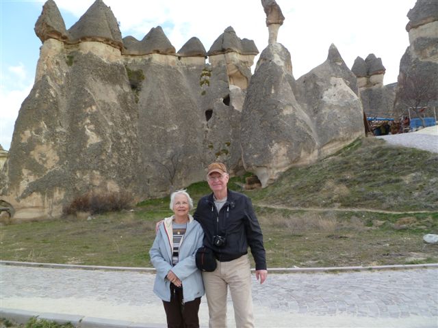 On our way back to the hotel that afternoon we stopped at the town of Goreme where we walked among the giant mushroom rock formations of limestone tent shapes with hard rocks capping them to create really unusual formations for great pictures. At Camel Rock some of the group climbed the mountain, and Bonnie rode a real camel.