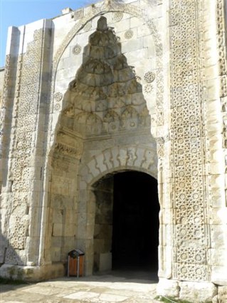 We stopped at Trahis Caravan Sarai, which Aladin built in 1229. In 1278 it was owned by Seljuk Turks. The entrance is most important with handmade Arabic letters in tiles, sometimes with a tree of life. Ottoman buildings are impressive; Seljuck ones have no dome. Ottomans have a dome and thinner minarets