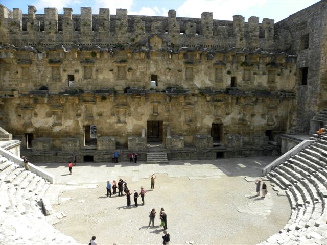 Next we went to Aspendos, founded according to ancient tradition in the 13th Century BC. In the 4th Century BC Alexander the Great took over the city, and then in the 2nd Century AD during the rule of the Roman Emperor Marcos Aurelius the huge theater and aqueducts were built. This Roman theater is one of the best-preserved ancient theaters in the world, seating 20,000 and still used today for concerts and stage productions. Because the Romans had figured out that the curve of an arch can hold up weight safely, they built theaters with an enclosed building behind the stage for the actors’ use, and seating was in semicircular shape. Greeks built amphitheaters in the side of a mountain with only horseshoe seating and had no stage building for these outdoor theaters but enjoyed the scenery of nature behind the stage.