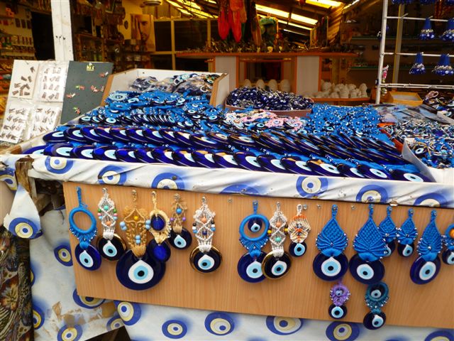In all the souvenir shops and bazaars we saw jewelry and home decorations with the blue Evil Eye Protection. For centuries superstitions have kept this shamanistic symbol to protect a person from negative energy emitted from other people, which could cause bad luck, loss, illness, or accidents. Few visitors leave without one of these truly Turkish souvenirs. A small one on a safety pin is a gift many merchants give visitors if they buy anything. Of all the Turkish handmade items rugs and tiles are the best value for the money.