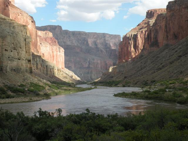 When she started commercial runs in the ’50s, she always took her guests on the steep hike up to the granaries carved into the cliffs by the Puebloan people in 1100AD at Nankoweap. We camped on the delta below and made the same stair-stepper climb. The storage rooms for corn grown by the native people are impressive, but the sweeping vista of the pumpkin coliseum cupping the coffee-brown Colorado winding its way to the Gulf of Mexico is mystical. At dusk the setting sun warms the canyon walls to a rosy glow as though shining through a stained glass window.