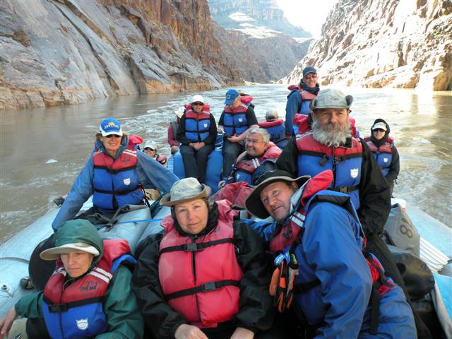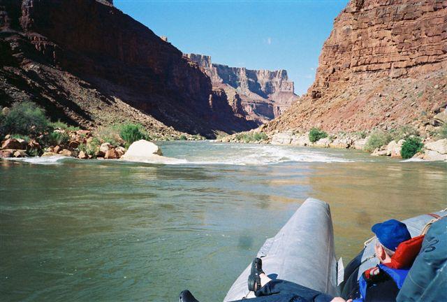 Each day on the river brought new wonders. Day one we motored through serene stretches of sandstone pharaohs, sphinx, and thunder birds. I saw Kokopeli, the randy prankster of the Southwest, who led many an Indian maid astray with his magic flute. A burst of white spewing from polished red rock called Vasey’s Falls seemed a miracle after miles of arid monoliths. Upper Granite Gorge on day two-or was it three-is a fun 40 miles of roller coaster rapids with big waves splashing over our bow. Where the opalescent waters of the Little Colorado merge with the now murky Colorado marks the end of Marble Canyon and the beginning of the Grand. Vistas widen, temples rise, cathedral buttes now olive green with sage-covered shoulders stippled with barrel cactus spread to the rim 10 miles away. Mysterious slot canyons carved by creeks merging with the main vein beg to be explored. Caverns in the river wall streaked with black and white designs bring to mind the pottery of the Native Americans who have long made this canyon their home. Clouds of teal-backed swallows and black and white swifts do fast flight maneuvers about our heads. Herons on the shore stand like sticks hoping to be ignored. A mountain sheep stares at us with dull recognition as we glide by his shore. It’s just another day on the river and each day there is more.