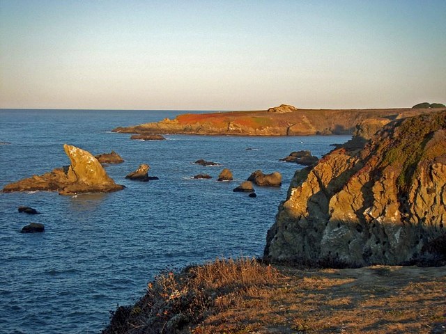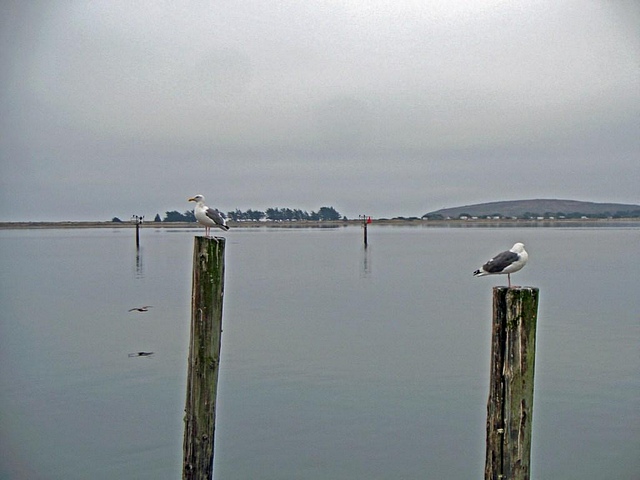 At Jenner, the Russian River flows from the redwood forests and spreads out just before pushing through the sand bar protecting its mouth, and empties into the sea. Beyond Jenner, we passed Russian Gulch, climbed a switchback road to the top of the bluff. We saw the offshore buoy,
