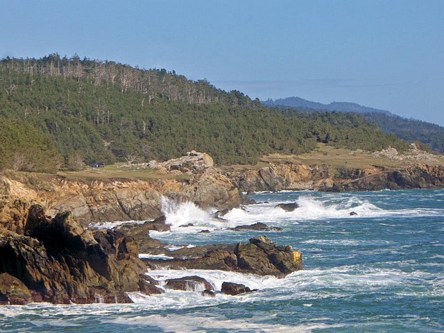 marked by a bell, for the deep water reef, Sunken Reef. Waves broke on another nearby shallow reef at Fort Ross, a popular abalone diver spot. The road comes closer to the Reef Campground shore where diver vehicles and trucks lined the road.