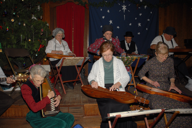 The highlight of my weekend’s theatrical entertainment was the surprise virtuosity of the Diamond W Wrangler singers at the Empire House Christmas Dinner at the living history Old Cowtown Museum. Their close harmonies ~ reminiscent to the “Sons of the Pioneers”~ along with tongue in cheek humor and a sufficient western style meal made the evening worth the effort to venture out in the cold. I was there during a Santa Claus visit, with his lap a venue for good little girls and boys, along with singing in the western church ~ complimented by guitars and dulcimers courtesy of the Great Plains Dulcimer Alliance and Acoustic Treasures ~ and wandering in the moonlight over boardwalks past wooden storefronts and Victorian styled houses lit by kerosene lamps, set the stage for a congenial wintry outing.