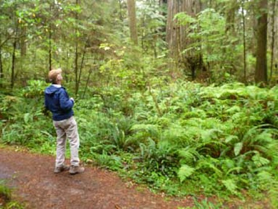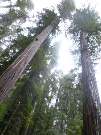The woods are totally silent, and in the rain and cold there is not even birdsong. We took the Mill Creek Trail which is mostly flat, wide, gorgeous, with the understory of luscious ferns and beautiful redwood sorrel, which looks like bright green plants in the shalpe of shamrocks. The trunks of the thousands of redwoods surrounding us as far as we can see in any direction are absolutely straight, and they have no limbs or foliage until about 100 feet up. Then the green tops reach so high we cannot see the tops of any of them. In a very few places sun gets through and there are deciduous trees there and grassy understory and berry bushes. The path crosses the Mill Creek in a couple of places and forks into two other trails. We almost got lost, thinking we were on a loop, but it made our walk longer and more beautiful.