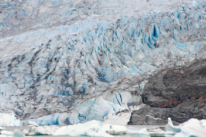 Sticking close to the water’s edge we paddle past cascading waterfalls, gravel beaches, and protruding wedges of land covered with dense green Northwest foliage and brush. Finally, we get to within three quarters of a mile of the glacier, and it’s noticeably colder here from the packed icebergs. All too quickly we turn away from this marvelous sight and paddle back to our beach.