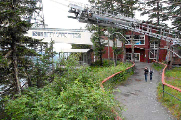 Back in Juneau, we take the Mount Roberts Tramway to the top of the steep, 2000-foot high mountain of the same name, and catch a breathtaking view of Gastineau Channel and Douglas Island far below us. This panorama of absolute seclusion is a powerful reminder of how Juneau can only be reached by boat or plane-there are no roads leading into Juneau from the mainland. We visit a half blind eagle in a shelter, walk along the hiking trail for a while, and watch an informative movie, Seeing Daylight, about Tlingit Indian legends, culture, and language.