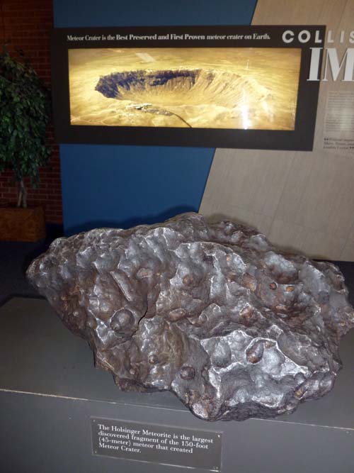 This Meteor Crater is the largest intact and best preserved of any meteor crater on earth. It is about a mile in diameter and 700 feet deep, a circular hole caused instantly by the impact of a meteor which was about 150 feet across and weighed several hundred tons. This meteor, a piece of an asteroid, crashed to earth around 50,000 years ago at a velocity of 26,000 miles per hour! The impact displaced 175 million tons of limestone and sandstone, throwing it into the air, melting and vaporizing iron and rock in an explosion equal to 20 million tons of TNT! The site is awe-inspiring.