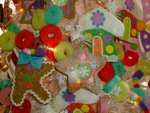 Many of the candies which decorate the Candyland Village and tree ornaments are real, but of course, these could attract unwanted little varmints, so the artists cleverly protected each item as they finished it with Mod Podge®,