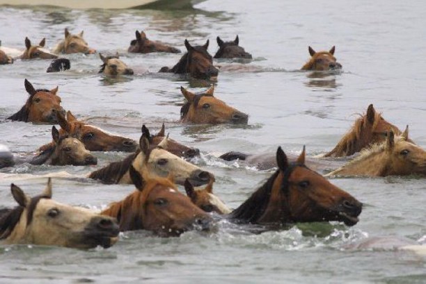 Since the mid-1920’s the local firemen have sold off the wild foals for money to buy much needed equipment, but it was not until that bridge was built did the auction become a major tourist attraction. But this is no ordinary auction. Remember these are wild ponies who spend their days in rough conditions, dining on saltwater marsh and other undesirable feed. According to “saltwater cowboy” Harry Thornton, so called because he’s one on 45 elite firemen who round up the 150 horses each July, swim them over to Chincoteague, and gather them again on shore for the parade to the auction grounds, “Most horses, raised on hay and grains, couldn’t last six months under the harsh conditions of Assateague, which is why the “ponies” (really little horses) rarely exceed 14 ½ hands in height.” Chincoteague is now an officially recognized breed of horse, smaller than usual, but unusually hardy, intelligent and athletic.