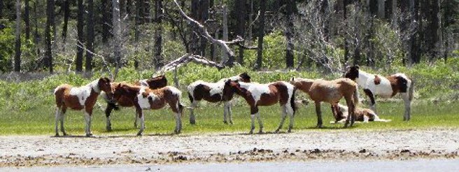 And there are many ways to view the horses: boat tours around Assateague; the Chincoteague Pony Center on Chincoteague, viewing areas at the Chincoteague National Wildlife Refuge on Assateague, and at the Refuge Inn, which houses its own small herd, on Chincoteague (yes, it’s confusing –- I gave up trying to figure out what was where about halfway through my visit). But the most up-close-and-personal connection with entire bands of ponies is provided by the Chincoteague National Wildlife Refuge bus tour on Assateague. The knowledgeable guide takes you close enough to see the foals nursing, while regaling listeners with tales of the ponies’ individual histories, their families, whom they hang out with, their idiosyncrasies and peccadilloes. Woeful Willy, for example, a somewhat depressed-looking pony, hangs out alone. Wanton Rambling Rose, on the other hand, “keeps company” with several stallions. A dark tan horse with an unkempt blond mane is known as, what else, Surfer Dude. The lives of the ponies unfold like an ongoing soap opera!