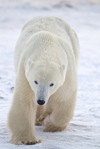 Photographers like me were driven out to the protected polar bear areas in polar tundra buggie,s which stand high on ten foot wheels. Inside the buggies the temps barely went above freezing. Shooters are permitted to put their lenses out a window in order to have a clear shot of the animals. There was also a “back porch” where folks could stand and be up close to the curious bears. All visitors were warned never to attempt to touch a bear… they are so powerful and strong that they can rip your arm off in one swat. Polar bears are known to pierce 2 feet of ice to capture seals swimming beneath the ice. I was able to capture extreme close ups of polar bears, adults exercising and mothers with cubs. During the time I was in the arctic, we experienced a blizzard with temperatures dropping to below -30 degrees.