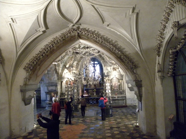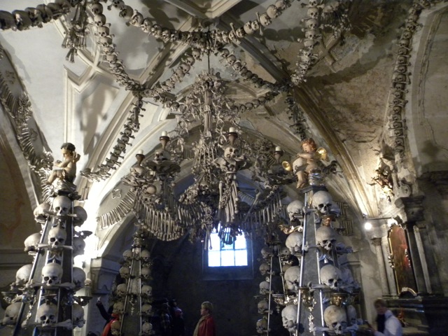 Our first stop on reaching Kutna Hora was the Sedlec Ossuary, which is a small Roman Catholic chapel next to the Cemetery Church of All Saints. The Ossuary contains the bones from an estimated 40,000 to 70,000 skeletons, which have been artistically arranged to decorate the interior of the chapel. The nearby cemetery became a popular place for burial when the abbot of the Cistercian monastery went to the Holy Land at the request of King Otakar II of Bohemia and returned with a small amount of earth he had removed from the hill in Jerusalem called Golgotha and sprinkled the earth on the abbey cemetery. During the 14th Century with the Black Plague sweeping the country, many thousands were buried in the cemetery. In the 1500s a half-blind monk of the monastery was given the task of exhuming skeletons and stacking the bones in the chapel. Through the years the bones were assembled into artistic decorations and became a great attraction.