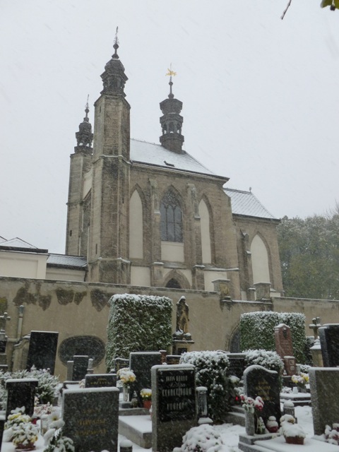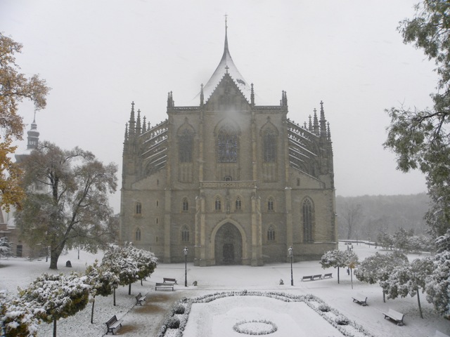 We were picked up at our hotel in the morning of our departure for Kutna Hora and began our journey through what turned out to be a little over two hour journey on a comfortable bus through a snow covered landscape. Prague and the Czech Republic had experienced an unexpected, overnight snowfall for this particular, late autumn time of year. Between the commentary about the history of the region given along the way by the tour guide accompanying us and the views of the snow covered fields, forests and towns we passed, the trip to and from the town of Kutna Hora passed quickly.