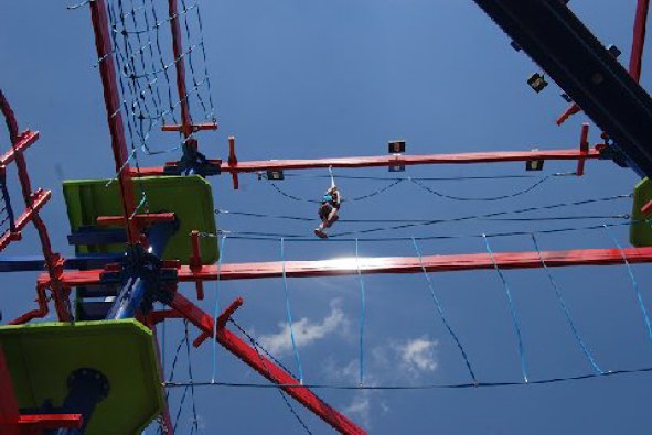 But it was the outdoor ropes course which extended more than 40 feet high with multiple challenging configurations of interlocking planks, wires, steps, and bridges, one more difficult to traverse than the other that really commanded attention. I couldn’t even watch Ellie as she progressed to the highest level, leaving many a grown man in her wake. From my perspective, she was walking a tight rope spanning 20 feet across, wind blowing, rope swaying, Ellie suspended in mid-air just below the cloud line. Again I had to close my eyes, but she appeared unfazed. I didn’t ask her if she wanted to revise her WonderWorks proclamation. Becca meanwhile was flying through the air several times running on the zip line. (Admission free; $25 per person, unlimited rides).