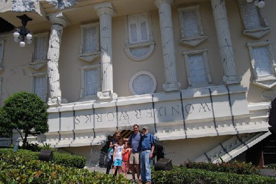 The entrance to WonderWorks — a visual oddity of upside-down windows, trees on their heads, and a crumbling façade with cracked columns in seemingly mid-collapse, lets you know upfront you’re in for a very bizarre experience. And we were not disappointed.